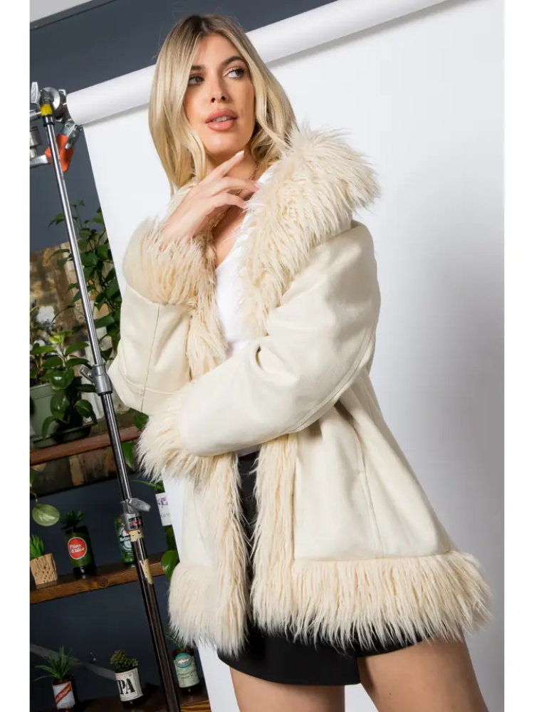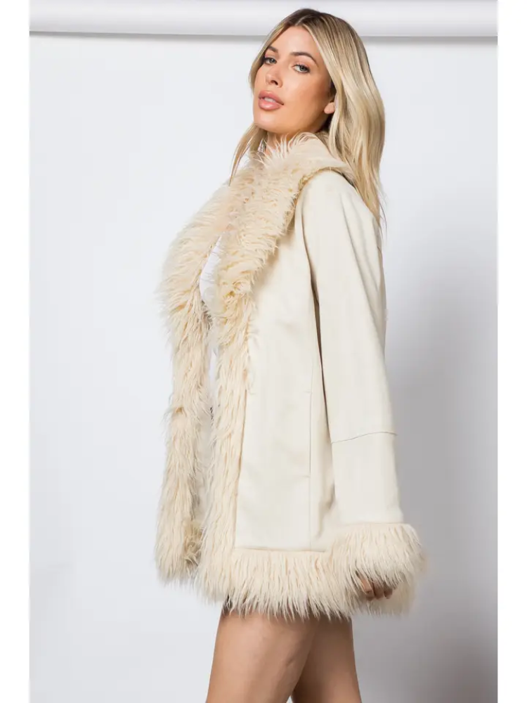 جاكيت فرو كثيف بمقاس عادي وأكمام طويلة من نسيج شمواه سادة وياقة من الفرو وحاشية سفلية وأساور مفتوحة من الأمام وجيوب جانبية متوسطة الطول