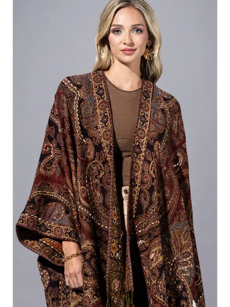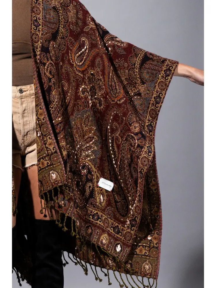 *ماريونت* استمتعي بدفءٍ فاخر مع هذه الروانا الصوفية المصنوعة يدويًا بالكامل. منسوجة بألوان ترابية عميقة من البرونزي والكستنائي والذهبي، ومزينة بنقشات بيزلي متقنة تُبرز تفاصيلها الحرفية. يوفر نسيج الصوف الناعم الراحة والأناقة، بينما تُضفي الشراشيب المربوطة يدويًا لمسةً من السحر التقليدي. تتميز هذه الروانا بتصميمها متعدد الاستخدامات وخلودها، حيث تُضفي ملمسًا غنيًا ورقيًا على أي إطلالة متعددة الطبقات. *100% صوف *الطول تقريبًا 36.5 بوصة، العرض 52 بوصة، الشراشيب طول 2.5 بوصة، الوزن 21.52 أونصة