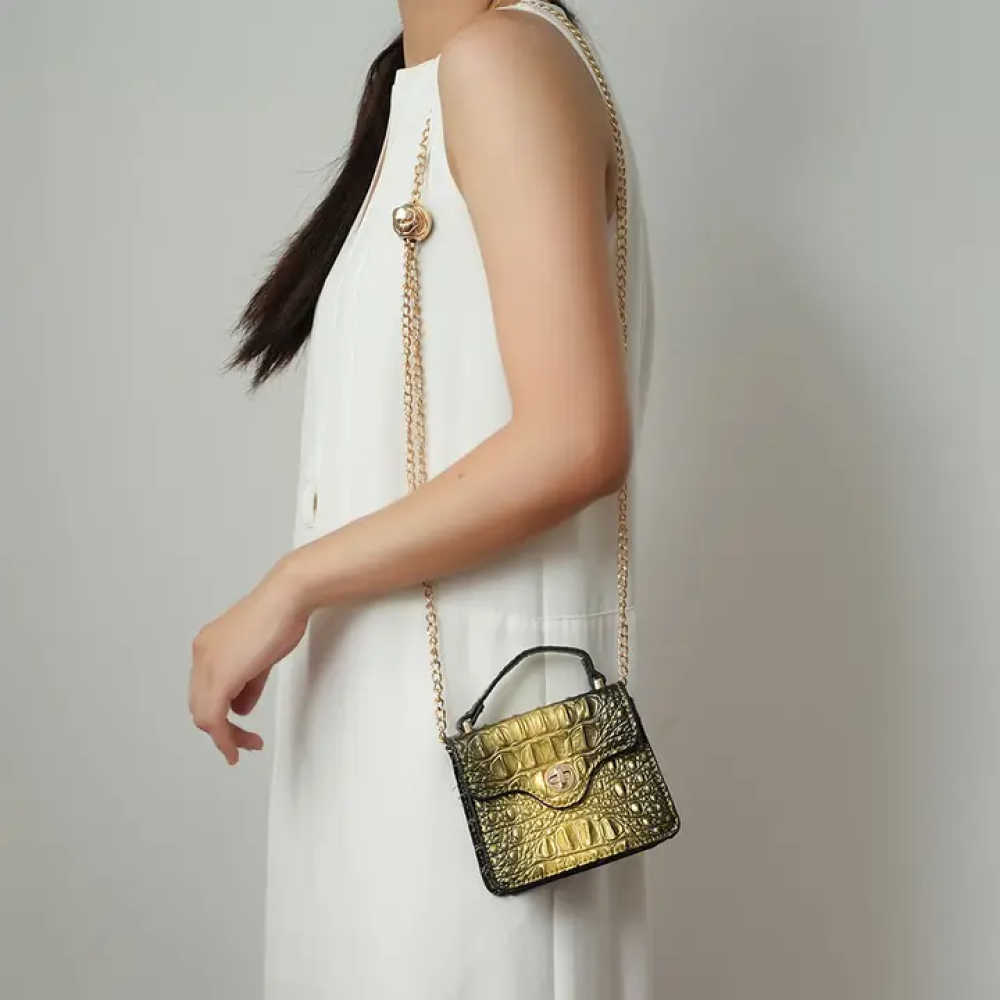 حقيبة ساتشل الصغيرة الفاخرة بنقشة جلد التمساح هي قطعة أنيقة ومدمجة، تتميز بملمس راقي بنقشة جلد التمساح وتصميم كلاسيكي. على الرغم من صغر حجمها، إلا أنها توفر مساحة للأغراض الأساسية مثل الهاتف الذكي، حيث تُغلق بغطاء أمامي بقفل دوار. حزام سلسلة ذهبي مصقول يُتيح حملها بشكل متقاطع، بينما يُتيح المقبض العلوي المُصمم بشكل أنيق حملها باليد. مثالية لإضفاء لمسة أنيقة على أي إطلالة، من غداء متأخر إلى سهرة مسائية. •الأبعاد: 15.24 سم طول × 10.16 سم ارتفاع × 5.08 سم عرض