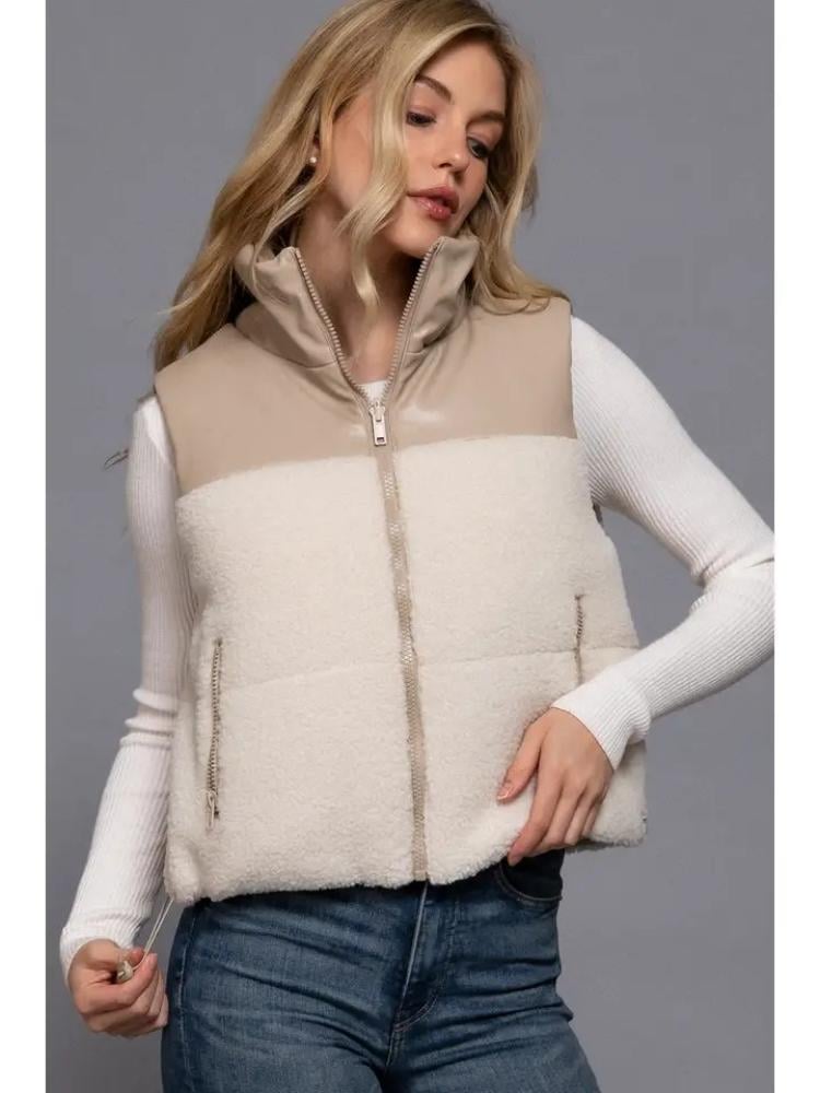 صدرية قصيرة قابلة للعكس من الجلد الصناعي وصوف الشيربا، مبطنة ببطانة متباينة، القماش: جلد صناعي 100% بولي يوريثان، ملصق "تحذير PROP. 65" مرفق. - منتجات جديدة، جديد 2025، أساسيات رياضية، ملابس خارجية رياضية أمريكية، خريف، شتاء، صدرية، بدون أكمام، صدرية جلدية، صدرية من الفرو، كلا الجانبين، دافئة، عصرية، صدرية مبطنة.