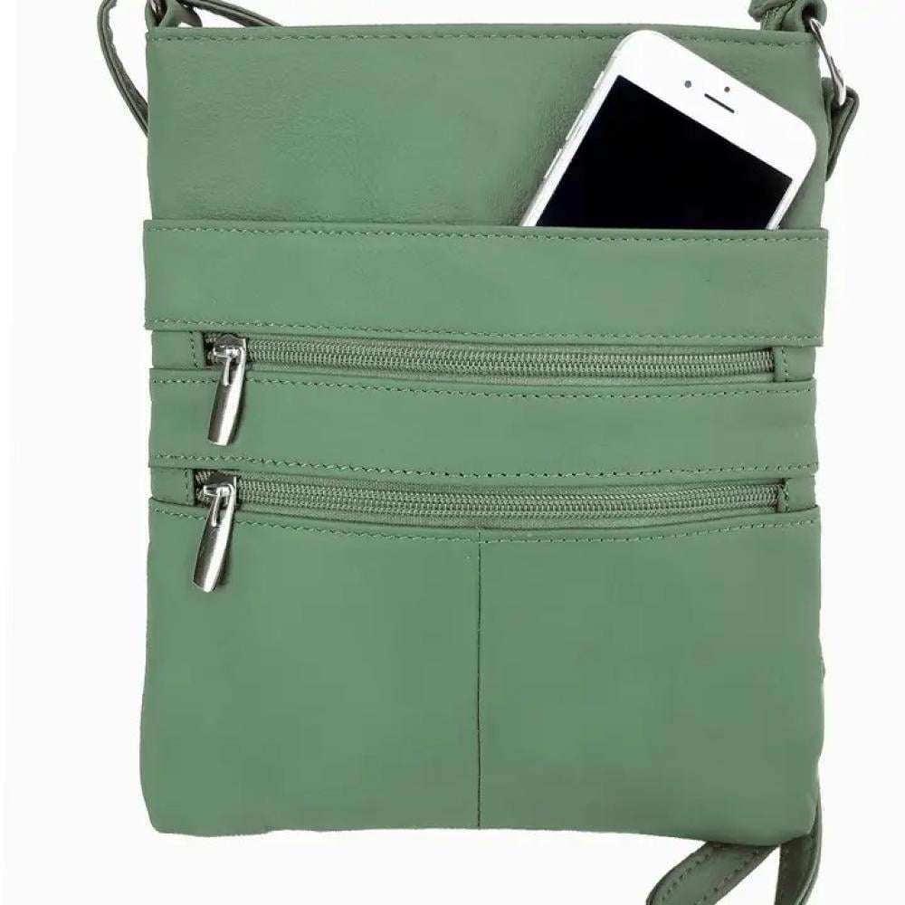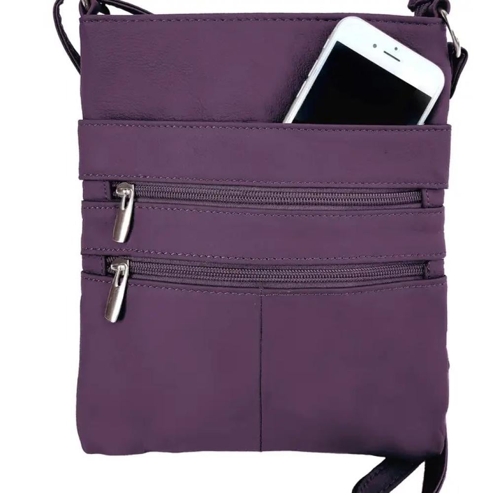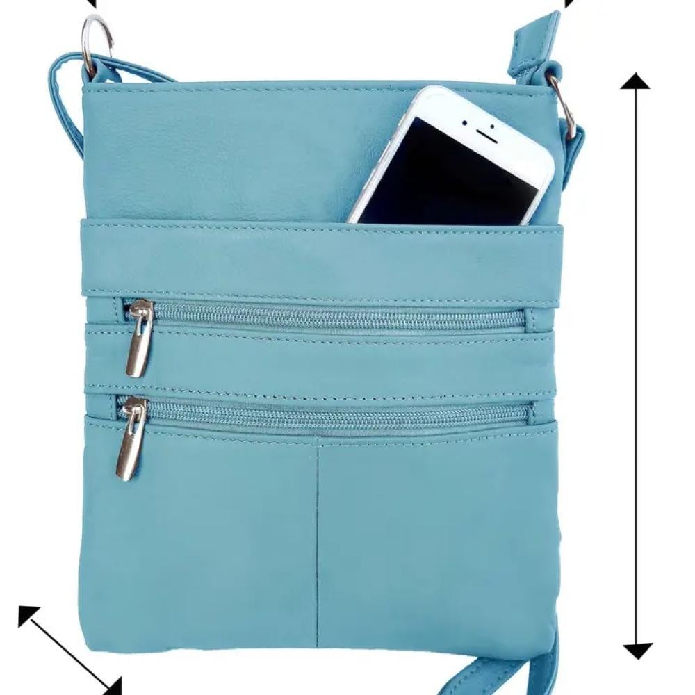 حجرة رئيسية واسعة. جيبان أماميان بسحاب. جيب صغير بإغلاق مغناطيسي في الأمام. جيب إضافي بسحاب في الخلف. حزام كتف قابل للتعديل. جلد بقر. المقاس: ٨ × ٨ بوصة