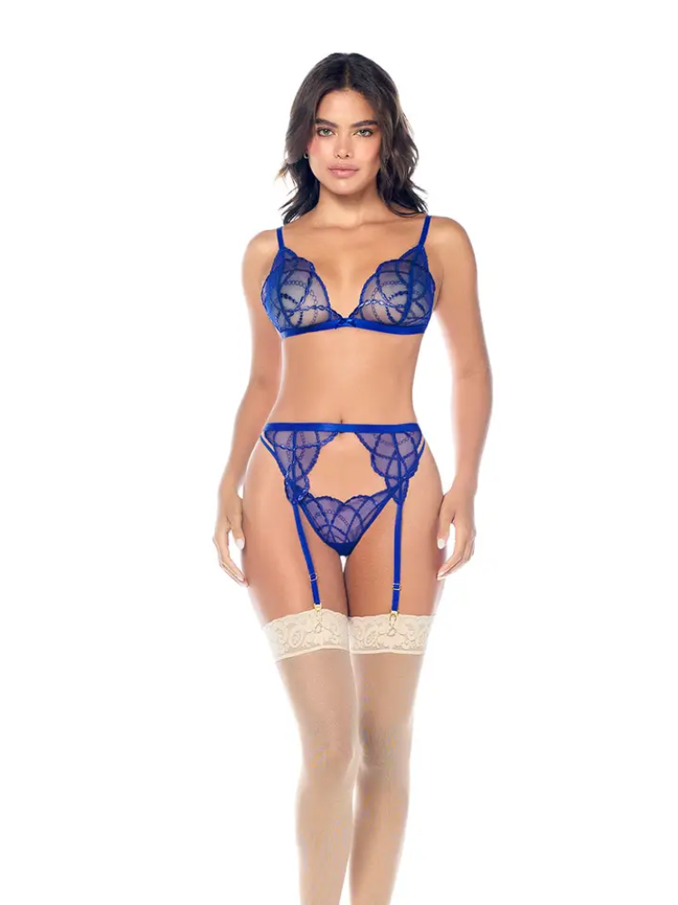 طقم كلاسيكي من ثلاث قطع، يتميز بتطريز دقيق بخيوط لامعة وناعمة تلتقط الضوء ببراعة. يتضمن بلوزة بحمالات قابلة للتعديل، وسروالًا داخليًا، وحزامًا للرباط لإطلالة متكاملة وأنيقة.